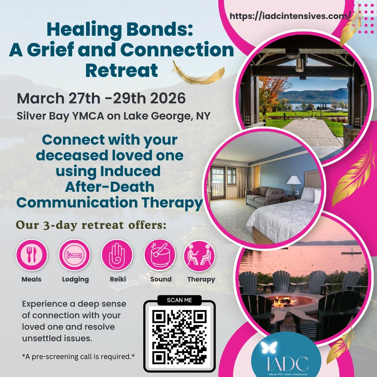 The cost of your three-day IADC retreat includes everything you need for a peaceful and supportive experience. You'll enjoy six nourishing meals, two nights of comfortable lodging, two 90-minute Induced After-Death Communication (IADC) sessions, and two Reiki healing sessions and more. Additionally, you'll receive a thoughtfully curated welcome kit featuring an altar candle, a personal journal, and a grief support tincture to enhance your healing journey. We will offer a grief fire ceremony Saturday evening and other grief education throughout the weekend.